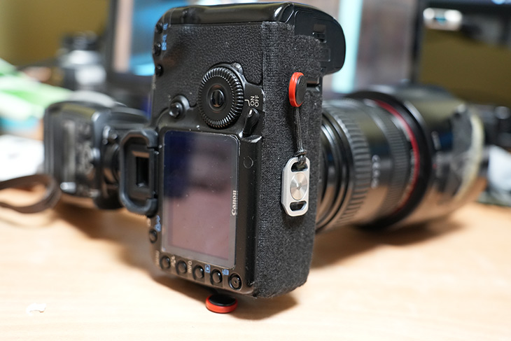 아래쪽에 퀵슈를 연결하고 앵커를 연결했습니다. 카메라 왼쪽에도 앵커를 연결하구요. 이렇게 한건 이 카메라는 실내 촬영시 스트로보가 거의 필수인데요. 그래서 스트로보 안걸리게 쓰려니 이렇게 연결하는게 편하더군요.