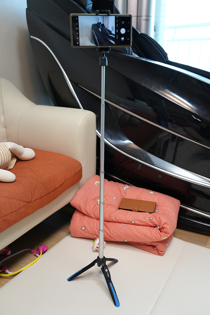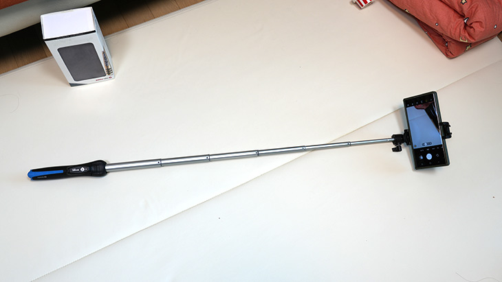 길이를 늘리면 이렇게 멀리서 촬영이 가능합니다. 스마트폰이나 VR카메라 하이엔드 카메라등 다양하게 연결한 상태로 촬영이 가능합니다. 실제 사용해 봤을 때 세로 촬영이 자유롭지 않은 부분이 좀 아쉬웠습니다. 물론 스마트폰 거치대를 바꾸면 되긴 하지만, 별도로 다른 구성품을 구매해야하는 부분이 생기네요. 물론 좌우로 넓은 사진과 동영상을 찍는다면 전혀 문제되지 않겠지만요. 165g으로 가벼워서 가방에 항상 휴대하면서 셀피촬영이나 라이블 방송 등을 위해서 편리하게 이용할 수 있는점은 꽤 괜찮았습니다.