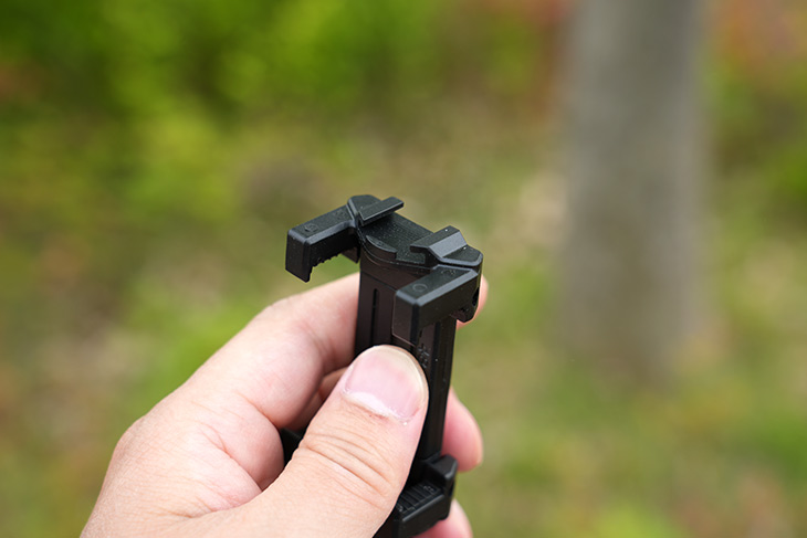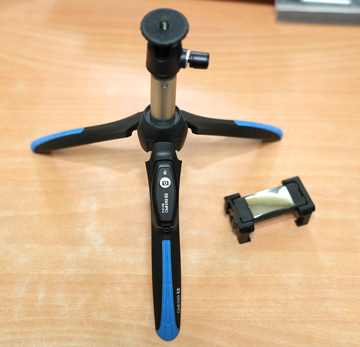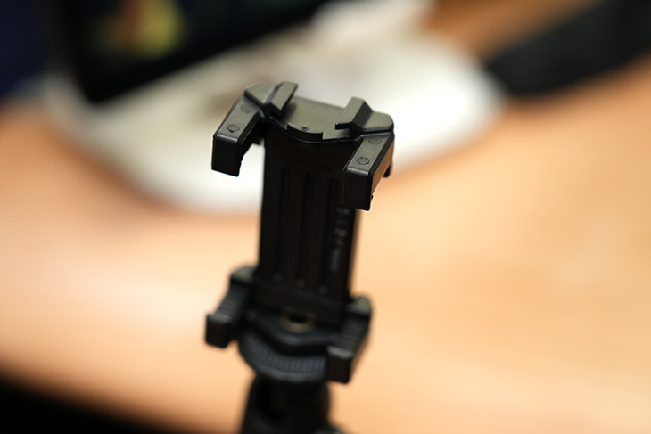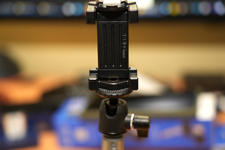 스마트폰을 거치하기 위해서는 펼쳐서 고정할 수 있습니다. 한가지 아쉬울 수 있는 부분은 삼각대에 고정하는 부분이 아래쪽에만 있어서 스마트폰을 가로로만 고정이 가능합니다. 회전이 되거나 그런 타입은 아닙니다.