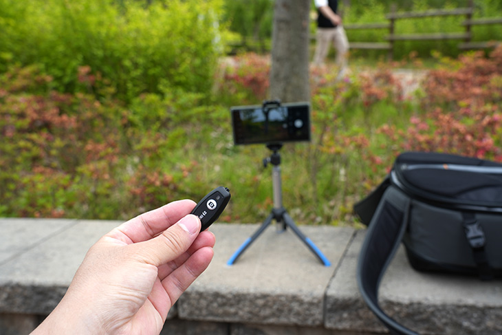 근데 여러장의 셀피를 찍을 때 매번 손바닥을 가르키다 보면 흐름이 끊기고 불편할 때가 있습니다. 그럴 때는 블루투스 리모컨을 쓰면 좋습니다.