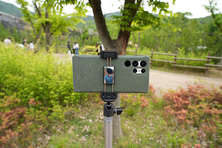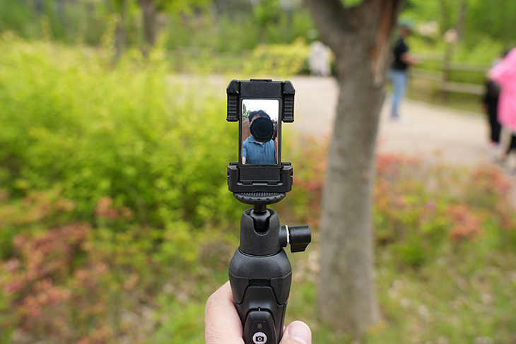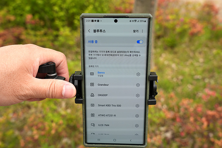 실제로 야외에서 사용을 해 봤는데요. 스마트폰을 거치해서 사용이 일단 가능합니다.