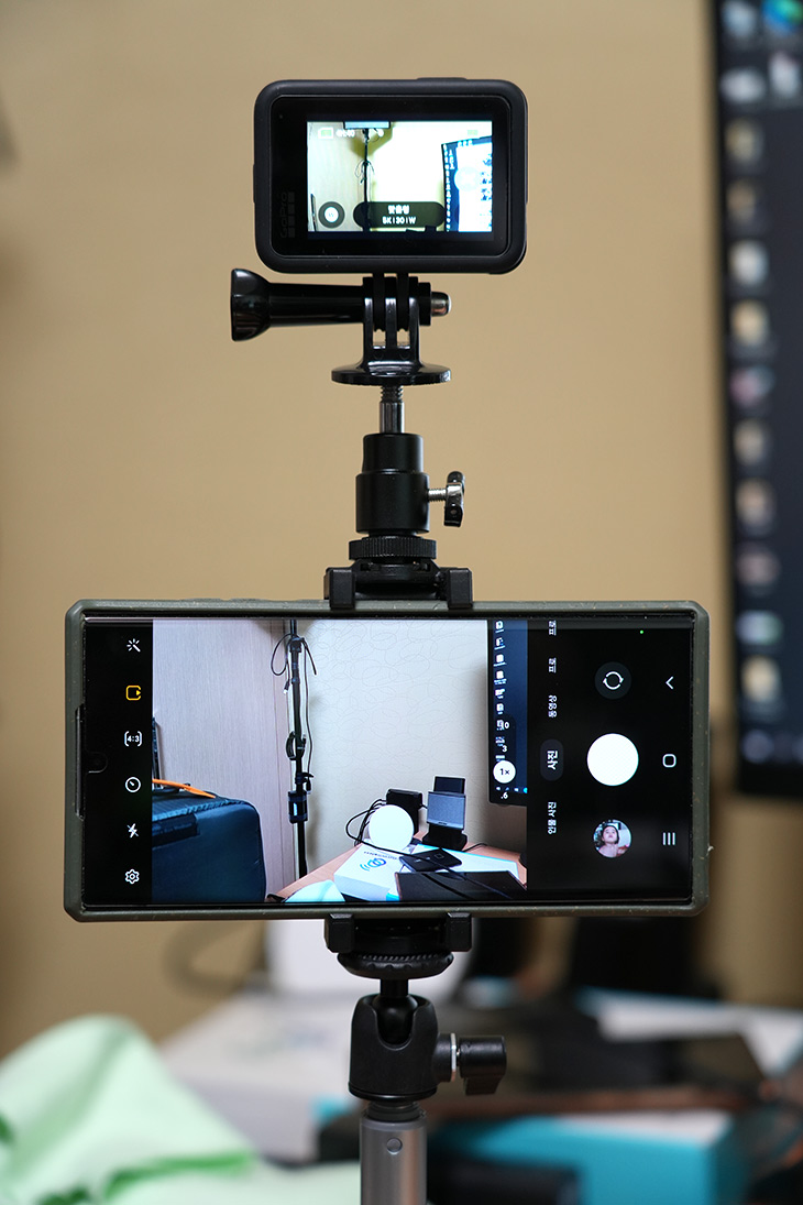 제 경우에는 스마트폰으로 생방송을 하는 중에 영상 녹화가 필요해서 작은 카메라로 동시 촬영을 하기도 하는데요. 상단에 고프로를 고정시켜놓고 이렇게 촬영하는게 가능합니다.