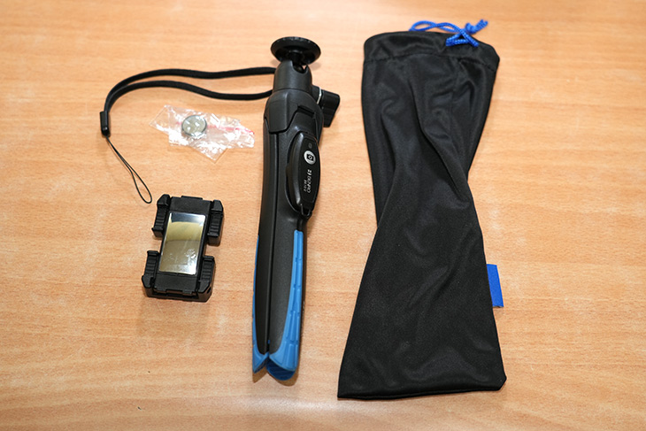 구성품으로는 파우치와 셀카봉 삼각대, 스마트폰 거치대 , 추가배터리, 스트랩이 들어가 있습니다.