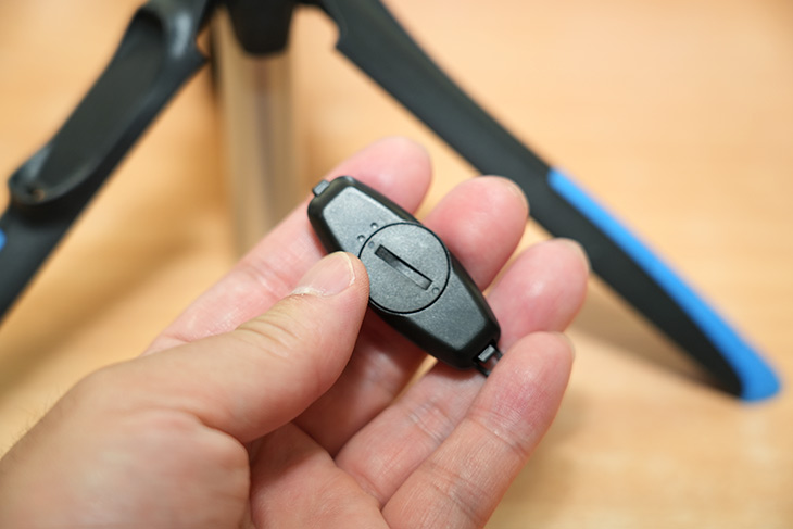 블루투스 리모컨이 다리에 붙어 있습니다. 리모컨은 쉽게 장착하고 분리가 가능한 타입 입니다.
