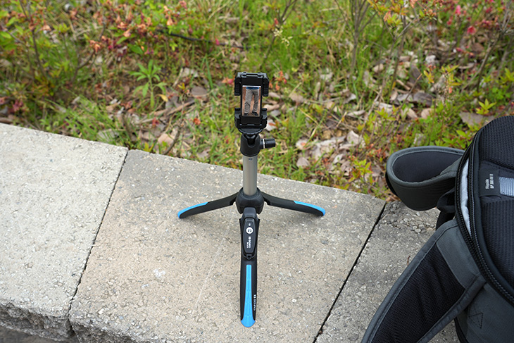 실제 사용하다보면 세로촬영이 필요할 때도 있는데요. 볼헤드를 이용해서 각도 조절이 가능하긴 합니다. 다만 무게 중심이 한쪽으로 쏠리니까 약간 불안정한 모습이 있긴 했습니다. 길이를 늘린 상태에서는 세로촬영이 사실상 힘들었습니다. 한쪽으로 바로 넘어집니다.
