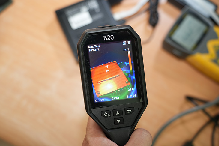 하판 부분은 온도가 좀 높은데 손으로 만져 봐도 많이 뜨거웠습니다. 아래 부분 온도는 아래쪽 측면 온도가 높았는데 74도까지 나오네요.