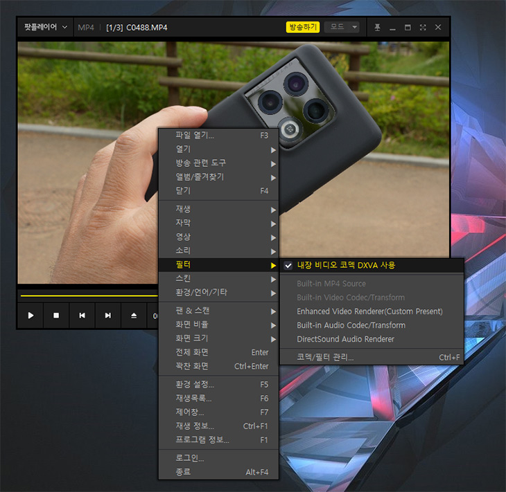 이런 영상을 재생 시 끊김을 줄이기 위해서는 DXVA를 이용하면되는데 그런데 이것을 켜도 끊기긴 하네요. 아무래도 CPU 클럭이 많이 떨어져서 어쩔 수 없는 부분인 듯 합니다. 즉 스트리밍으로 재생하는 영상을 볼 때는 네트워크 상황에 따라 대역폭이 조정되면서 재생되므로 사실상 끊김을 느끼긴 힘듭니다. 그런데 가지고 있는 영화를 직접 재생하거나 할 때는 너무 고화질 영상은 끊길 가능성이 있긴 합니다.