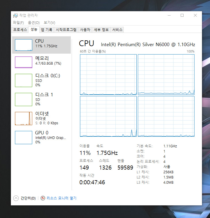 시간이 많이 지나면 CPU 사용율에 여유가 생깁니다. 이때부터는 처음보다는 많이 빨라집니다. 그런데 그렇다고 해도 N6000 프로세스가 엄청나게 빠른 프로세스가 아니다보니 약간 느린감은 있습니다. 터보부스터가 동작하면 3.3GHz까지 동작하긴 하지만 보통은 1~2GHz 사이에서 동작하고 그리고 여러개의 프로그램을 동시 수행시 모든 코어에 동작이 걸리면서 0.9GHz 이렇게 올라가기도 합니다.