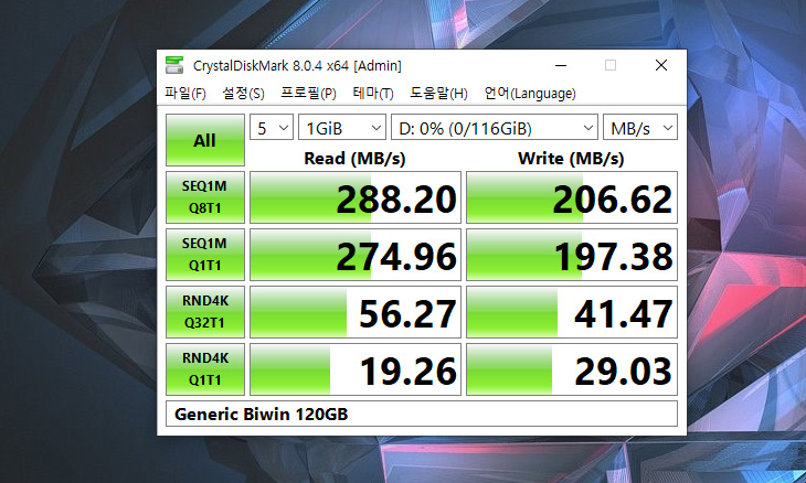기본저장소의 성능을 테스트 해 봤는데요. 성능이 매우 높진 않으나 그래도 이 미니PC에서는 사용하기 충분한 성능이 나옵니다. 사실 SSD만 속도가 엄청나게 빠르다고 해도 CPU 성능이 낮은편이라 큰 의미는 없을듯 하네요. 기본저장소로 사용하고 용량을 늘려야한다면 M.2 슬롯을 이용해서 저장소를 늘리면 될 것 같습니다.