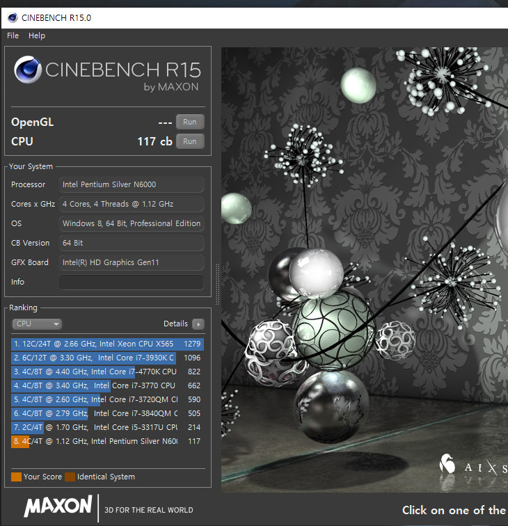 씨네벤치 R15를 돌려 봤는데요. CPU 점수가 117cb가 나옵니다. 성능이 좀 느린 Core M 프로세서도 이것보다는 훨씬 빠르게 나오긴 하는데요. 좀 처잠하긴 하죠. 성능이 높지는 않습니다. 저전력CPU라는 부분을 분명히 해야 합니다.