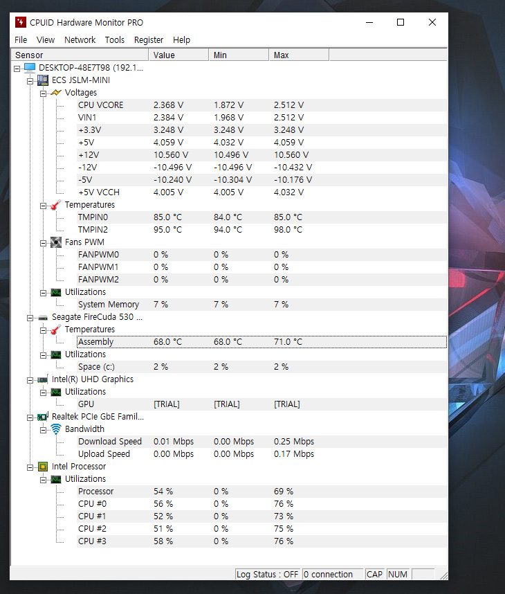 미니PC를 사용할 때 이상하게 하판 부분온도가 꽤 높았는데요. 팬이 아무래도 없다보니 시스템을 사용시 온도가 좀 높게 올라갑니다. SSD 온도가 71도까지도 올라가고, 시스템도 95도까지도 올라가네요.