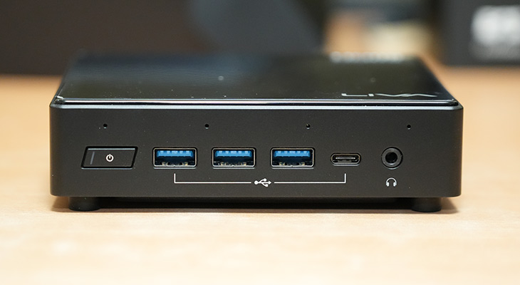 전면에는 전원버튼과 USB 3.2 Gen1 포트 3개, USB 3.2 Gen2 Type-C 포트가 1개 있습니다. 그리고 헤드폰 단자가 있습니다.