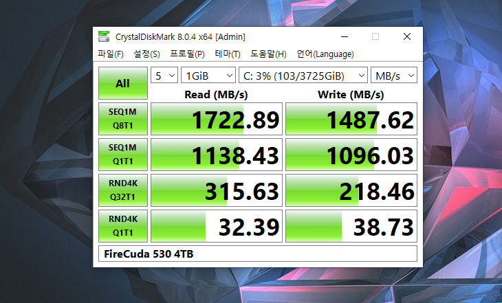 SSD 성능도 테스트를 해 봤습니다. 별도로 FireCuda 530 4TB를 장착을 했었습니다. 가장 빠른 SSD이죠. 순차 읽기는 1722MB/sec, 순차 쓰기는 1487MB/sec 가 나옵니다. 성능이 재대로 나오진 않는데 인터페이스는 PCI-E를 지원하는게 맞지면 아무래도 전체적인 성능 때문에 성능이 좀 낮게 나왔다고 봐야할 것 같습니다. 최대 속도가 이정도라고 보시면 될듯 합니다.