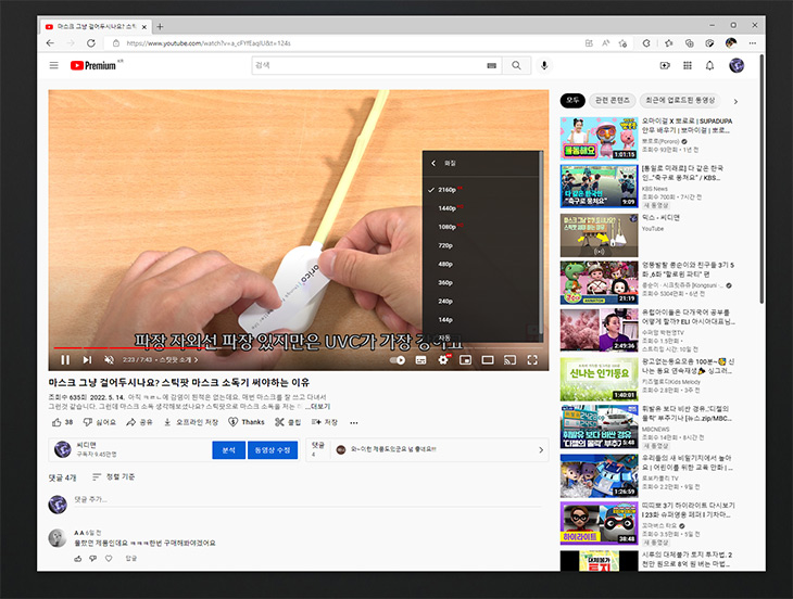 유튜브에서 4K 영상을 재생을 해 봤습니다. 4K 모니터까지 지원을 하므로 4K 영상 재생이 잘 되는지 여부는 꽤 중요했습니다. 걱정과는 다르게 유튜브에서 4K 영상은 매우 잘 재생이 되었습니다. 다만 영상을 최대화하고 원래 크기로 돌리는데 있어서 약간 딜레이는 존재 합니다. 다만 한번 재생되고 있는 상황에서는 끊김 없이 잘 재생이 됩니다. 영화나 영상을 보는 용도로는 나쁘지 않은 것이죠.