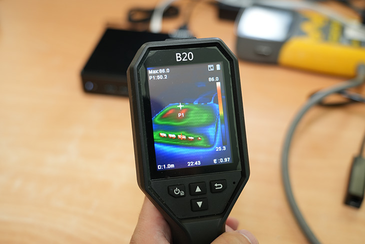 열화상카메라로 미니PC의 상단 부분을 온도를 체크를 해 봤습니다. 단자 부분의 온도가 좀 높게 나오죠. 아무래도 내부 온도가 나온 부분인데 86도까지도 보이네요. 그런데 상단 부분 표면 온도는 꽤 낮은 편 입니다.