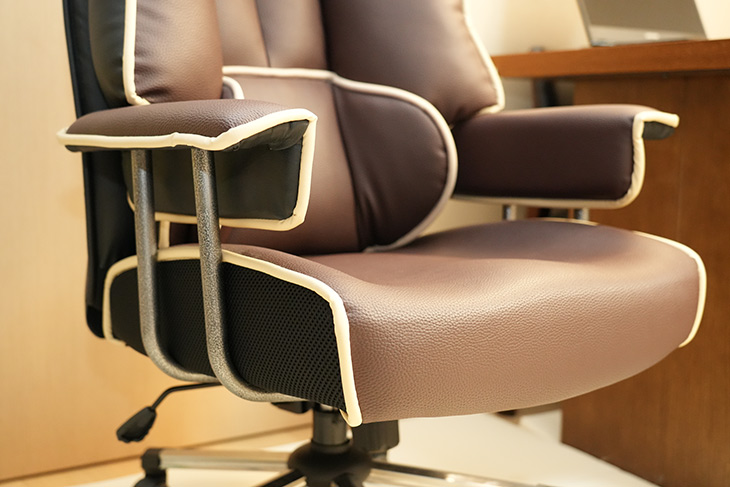 측면 디자인을 보면 아래 시트가 얼마나 두꺼운지 볼 수 있습니다. 팔걸이대도 생각보다 두툼합니다. 측면에 팔걸이 지지대가 노출되어 보이는게 좀 이상해 보일 수 있으나 잘 보면 엄청 두꺼운 튼실한 스틸재질로 되어있습니다.
