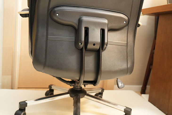 등받이 부분을 잡아주는 부분도 꽤 튼튼한 철제 프레임으로 되어있습니다. 뒷부분은 가죽재질로 안되어있어서 좀 아쉽긴 하지만, 튼튼히 잡아주기 위해서 이런 모양으로 되어있습니다.
