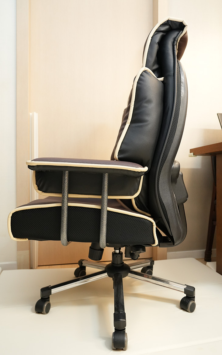 측면 디자인을 보면 아래 시트가 얼마나 두꺼운지 볼 수 있습니다. 팔걸이대도 생각보다 두툼합니다. 측면에 팔걸이 지지대가 노출되어 보이는게 좀 이상해 보일 수 있으나 잘 보면 엄청 두꺼운 튼실한 스틸재질로 되어있습니다.