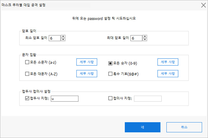 옵션에서 자신이 알고 있는 암호에 대해서 최대한 조건을 걸어야 합니다. 제가 설정한 암호는 u로 시작하는 암호 입니다. 그래서 접두사를 u로 했습니다. 최소 암호 길이는 6자리로 했습니다. (기본값은 1자리 입니다.) u뒤에 숫자 5개가 오는 암호이므로 모든 숫자로만 지정했습니다.