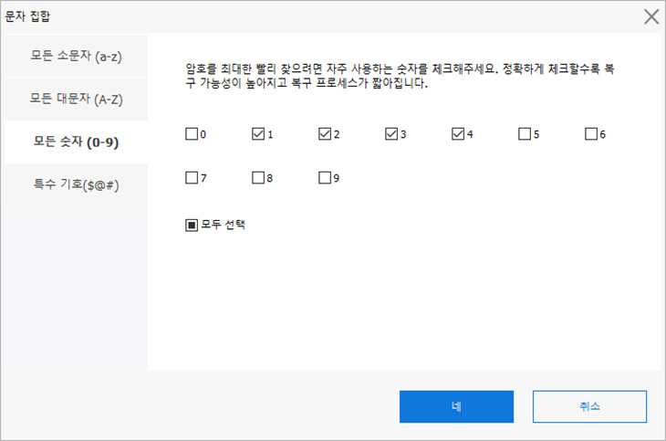 숫자의 경우에도 특정 숫자를 지정할 수 있는데요. 모른다면 모두 선택을 해야겠지만 만약 어떤 숫자만 들어가는 암호라는 것을 알고 있다면 그것을 지정하는게 좋습니다. 그래야 암호를 여는데 시간을 단축 시킬 수 있습니다.