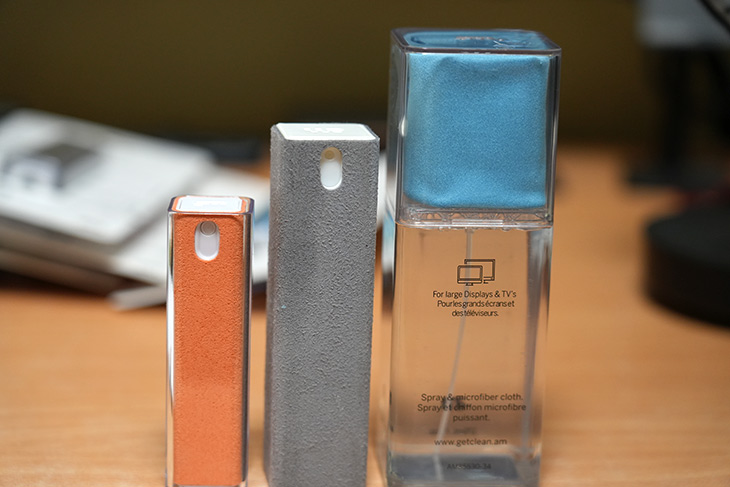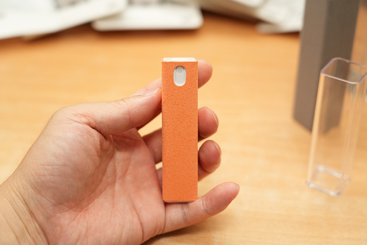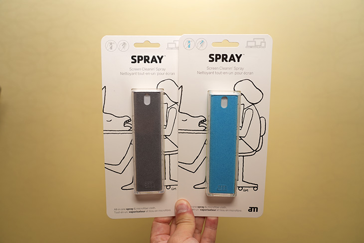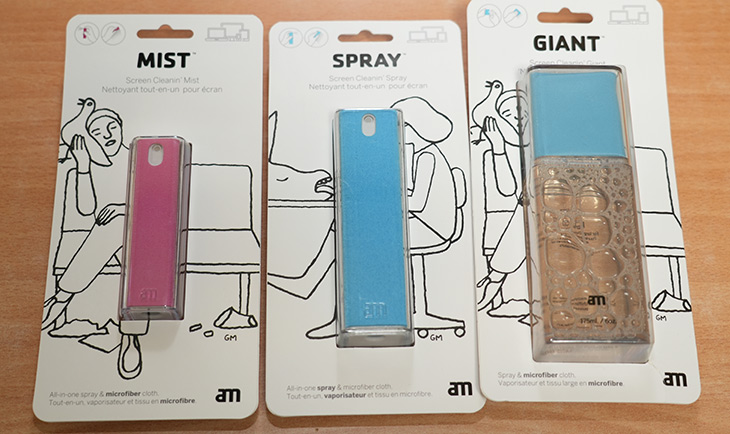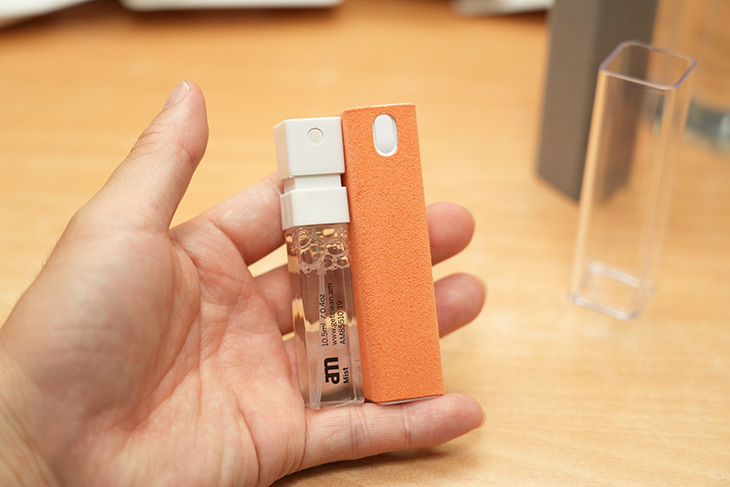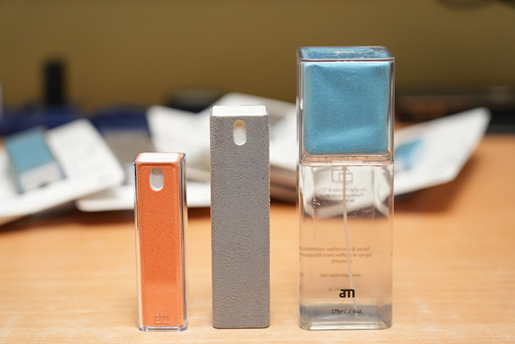 AM 스프레이는 약간 더 큰 사이즈를 가지고 있고 태블릿이나 컴퓨터 모니터 등 좀 더 큰 사이즈의 화면을 닦을 때 좋습니다. 물론 스마트폰 화면도 닦을 수 있습니다.
