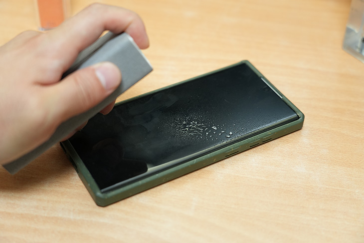 스마트폰을 실제로 닦을 때는 액상을 1-2 번정도 뿌려줍니다.