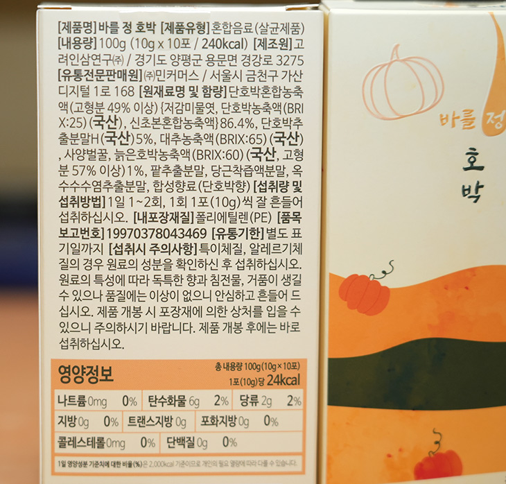 이 제품은 HACCP 인증도 되어있고, 성분도 깔끔하게 다 표기가 되어있는데요. 단호박혼합농축액이 86.4%가 들어가고, 단호박추출분말H가 5%, 늙은호박농축액 1%가 들어가 있습니다.