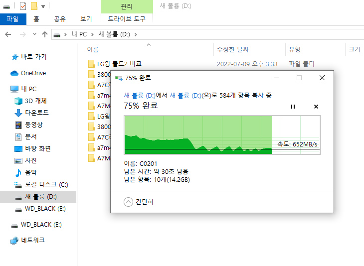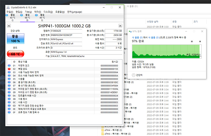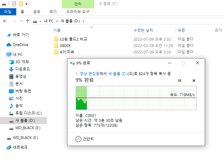 10Gbps를 지원하는 외장 SSD에서 Platinum P41로 복사를 시켜 봤습니다. 읽기 미디어가 속도가 아무래도 10Gbps로 제한이 걸려있다보니 쓰기 속도는 조금 낮게 719MB/sec 전후로 나오는데요. 그래도 꽤 빠르게 잘 유지합니다.