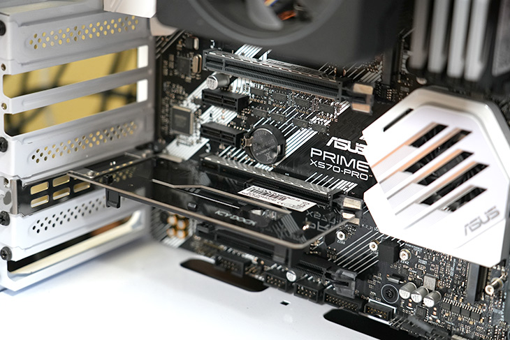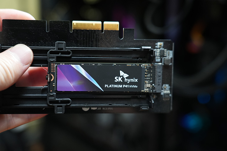 이 메인보드는 PCIe 4.0을 지원을 하므로 SSD의 최대 성능을 사용 할 수 있습니다. 컨버터를 이용해서 장착했으나 메인보드에 있는 기본 M.2 슬롯에서도 사용이 가능합니다.