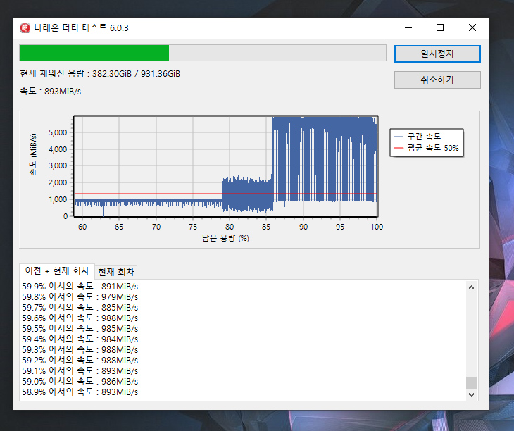 쓰기 지속 성능을 보기 위해서 더티 테스트를 해 봤습니다. 지속적인 쓰기 테스트를 통해서 얼마나 쓰기 속도를 유지하는지 확인해볼 수 있는데요. 85% 이전 구간에서는 아주 높은 속도를 유지하다가 그 이후에는 2000MB/sec 정도로 속도가 떨어집니다. 그 이후에도 계속 쓰기를 시키면 900MB/sec 전후 정도로 속도가 떨어지긴 합니다. SLC캐싱이 있어서 그래도 쓰기 속도가 어느정도는 꽤 유지를 하는 모습을 보였는데요. 물론 처음부터 끝까지 계속 높은 속도를 유지해주는 제품은 아직까지는 레이드로 연결을 하지 않는한 구현할 수 없는데요. 일상 생활에서 사용하는 내에서는 속도 저하는 크게 느끼지 않고 사용할 수 있을 것 같습니다.