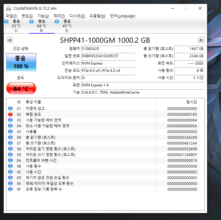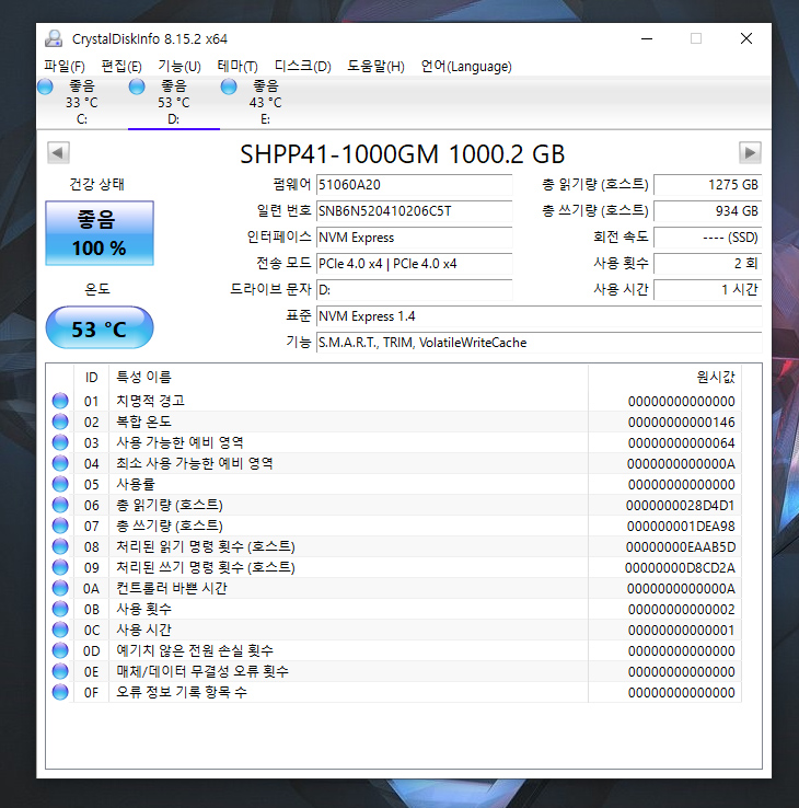 크리스탈디스크인포 정보인데요. 이 SSD 자체는 GC, TRIM 등을 모두 지원하며 SLC 캐싱까지 지원해서 특별히 어느 부분이 부족한 부분은 없습니다.
