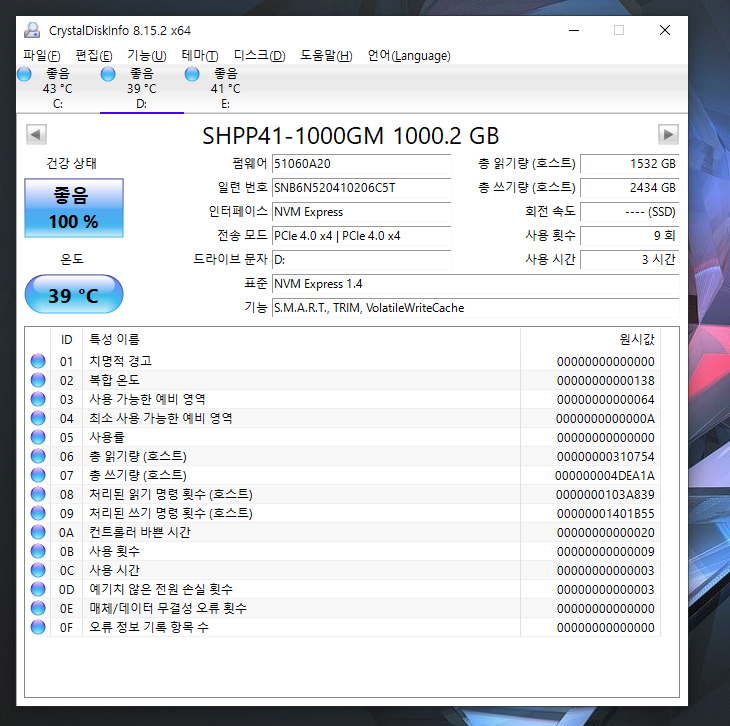 크리스탈디스크인포 정보인데요. 이 SSD 자체는 GC, TRIM 등을 모두 지원하며 SLC 캐싱까지 지원해서 특별히 어느 부분이 부족한 부분은 없습니다.