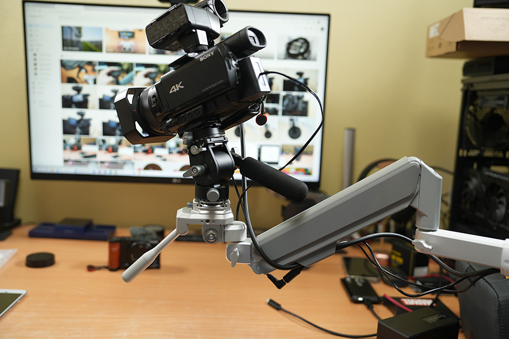 기어트리에 연결한 모습 인데요. 캠코더와 마이크를 이렇게 연결해서 쓰는데 너무 편합니다. 편한 상태에서 유선 리모컨도 연결해서 (흔들림을 막기 위해서) 사용하는데 딱 하나 불편했던 점이 배터리 부분이었습니다.