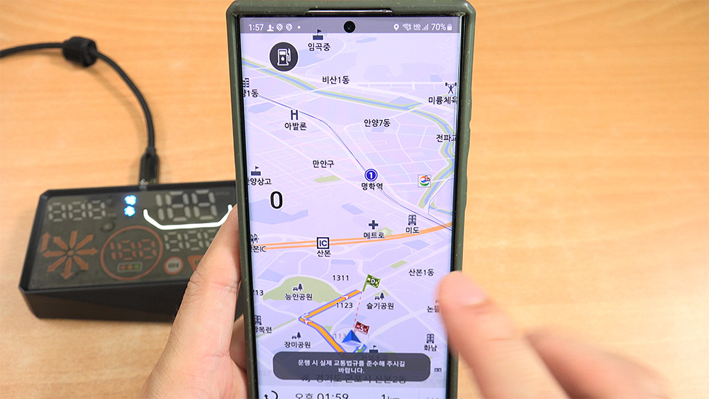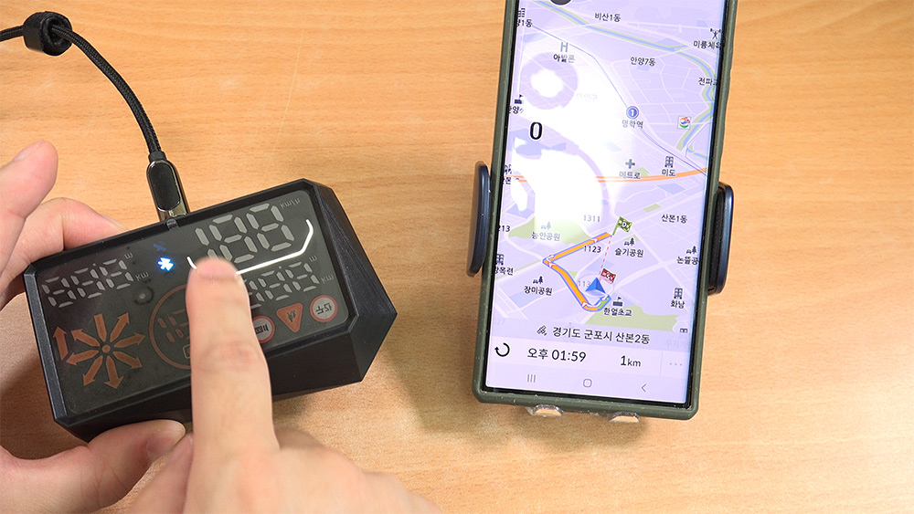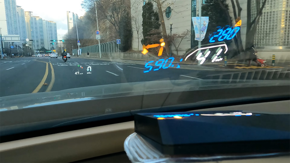 차량의 속도가 나타나고 방향을 알려주다보니 주행할 때 정말 많이 도움을 받을 수 있습니다. 운전하다가 속도를 규정속도에 맞추려고 계기판을 보다보면 시선을 빼앗길 수 있는데요. 그런데 HUD를 쓰면 시선을 빼앗기지 않아서 편합니다.
