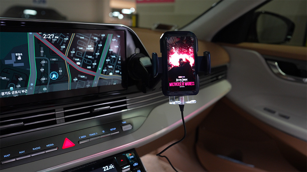 실제로 무선충전기를 사용하고 있는 모습 입니다. 주행을 하면서도 사용을 해 봤는데요. 튼튼하게 잘 붙어 있네요.
