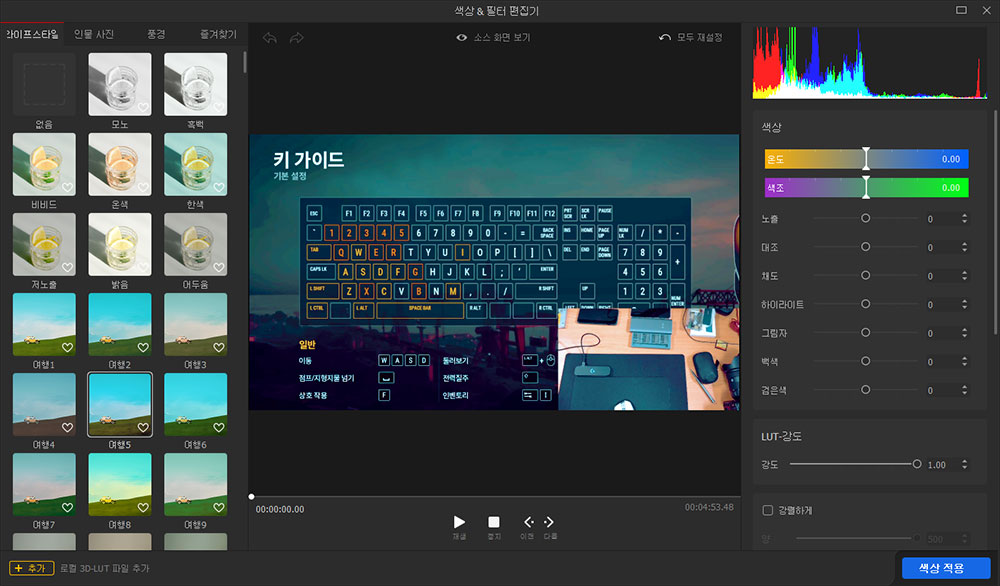 색상 필터 효과도 꽤 많이 지원합니다. 간단하게 선택하는것으로 적용 가능하며, 색상 및 다양한 옵션도 수동으로 자신이 원하는대로 조정이 가능합니다.