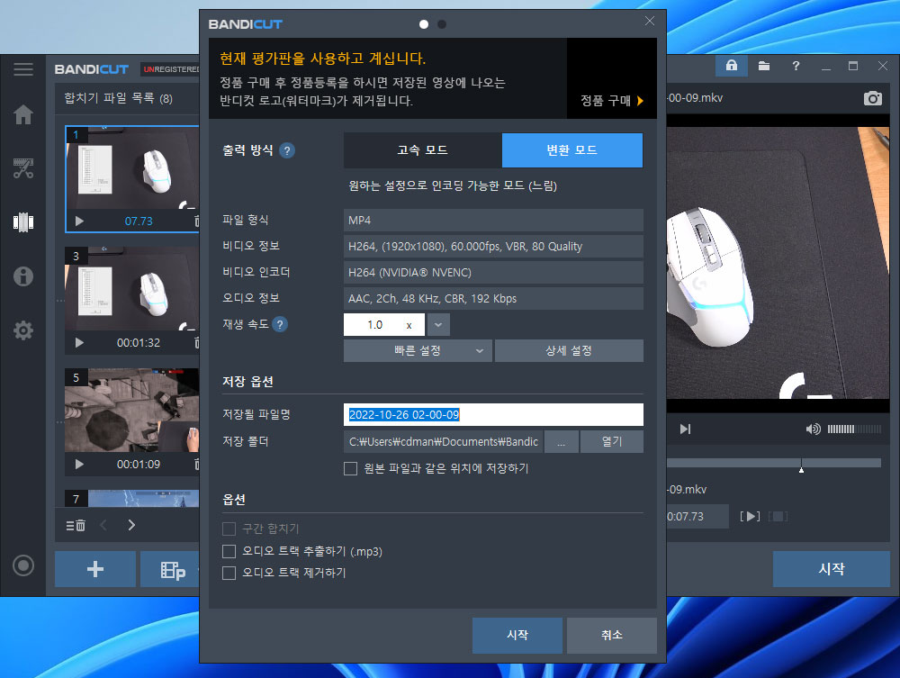 영상을 하나로 합칠 때는 변환모드나 고속모드 이용하는데 평가판은 로고(워터마크)가 들어갑니다. 이것이 들어가지 않길 원하면 구매를 해야 합니다. 근데 좀 뭔가 아쉬운 프로그램 입니다.