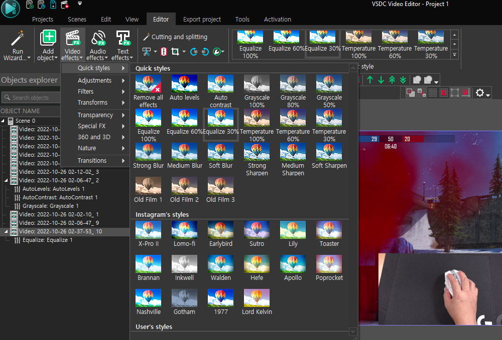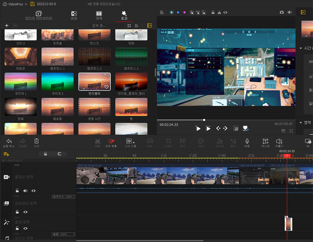 생각보다 많은 효과들을 지원하는 부분도 나쁘진 않았습니다. 아쉽다면 파일 추가가 너무 오래 걸려서 답답함이 든다는 점과 안정화나 특수효과, 컬러보정 등 아주 전문적인 기능이 없는 부분은 좀 아쉬웠습니다.