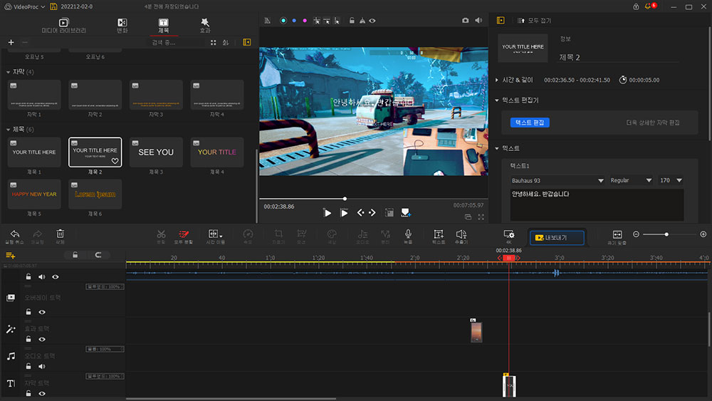 제목을 넣는 부분도 간단히 추가가 가능했습니다. 전체적으로 완성도나 기능성이 꽤 훌륭한 편집 프로그램이었습니다. 굳이 아쉽다면 LUT을 적용하거나 아주 전문적인 기능들이 좀 빠져 있는 정도.