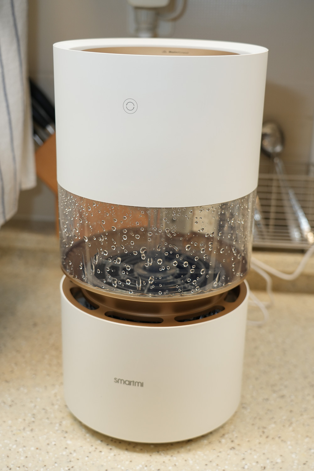 동작을 시키면 아래에서 물이 뿜어져 나오면서 상단으로 바람이 나옵니다. 바람을 통해서 물이 자연적으로 기화되는 방식입니다. 초음파를 이용해서 물을 잘게 쪼개서 강제로 공기중으로 뿜어내는 방식보다 자연가습식이 훨씬 안전하고 좋습니다. 주변에 습도가 너무 높다면, 자연기화식 가습기는 아무리 동작시키더라도 물이 잘 기화되지 않습니다. 즉 필요 이상으로 습도가 높아져 곰팡이가 생기거나 그런 문제가 없다는 뜻이죠.
