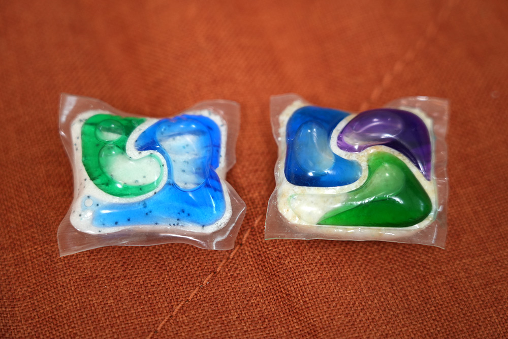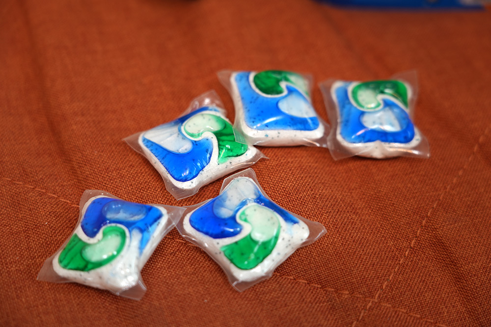 내부에 세제가 보입니다. 90개가 들어가 있는데 맞겠죠 뭐. 세제와 린스가 같이 합쳐진 형태이고 그냥 1개씩 꺼내서 쓰면 됩니다.