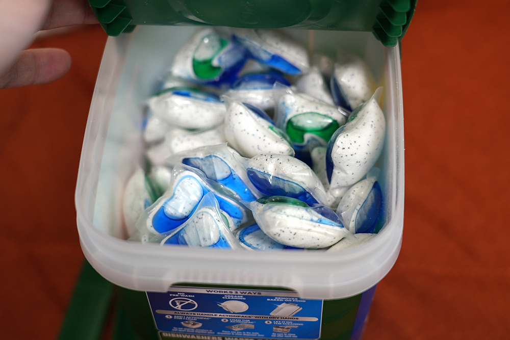 내부에 세제가 보입니다. 90개가 들어가 있는데 맞겠죠 뭐. 세제와 린스가 같이 합쳐진 형태이고 그냥 1개씩 꺼내서 쓰면 됩니다.