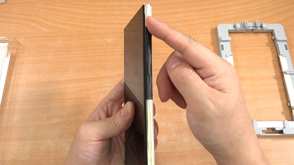 강화유리를 위에서 부터 맞춰서 붙입니다. 부착지그에 맞춰서 맨 위에 맞춘 뒤 붙이면 딱 맞습니다.