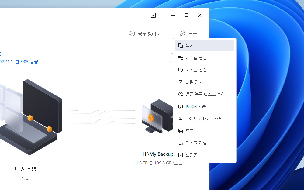 별도의 메뉴로 도구에 보면 복제, 시스템 클론, 시스템 전송, 파일검사 등 다양한 메뉴를 지원 합니다.