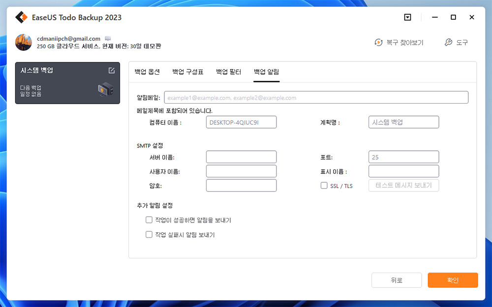 백업 알림도 보낼 수 있습니다. 주기적으로 백업할 때 시스템이 잘 백업되고 있는지 이메일로 보내서 확인도 가능합니다.
