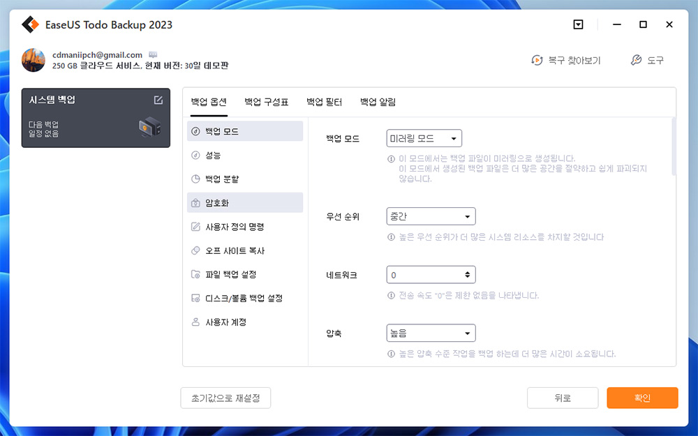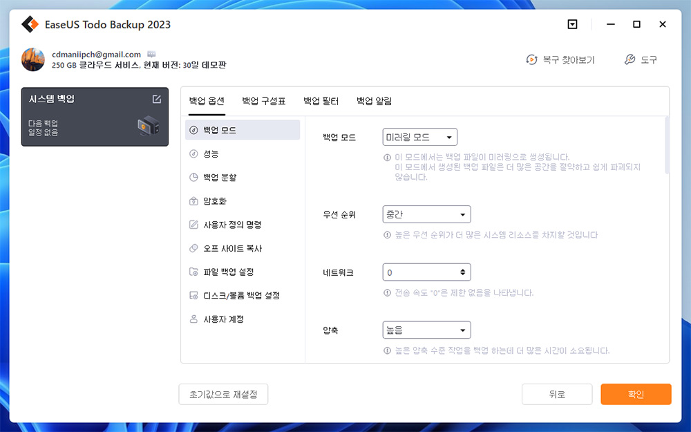 옵션에 들어가면 여러가지 옵션들을 볼 수 있습니다. 백업 옵션에 보면 백업 모드와 우선순위 네트워크 압축 등을 지정할 수 있습니다.