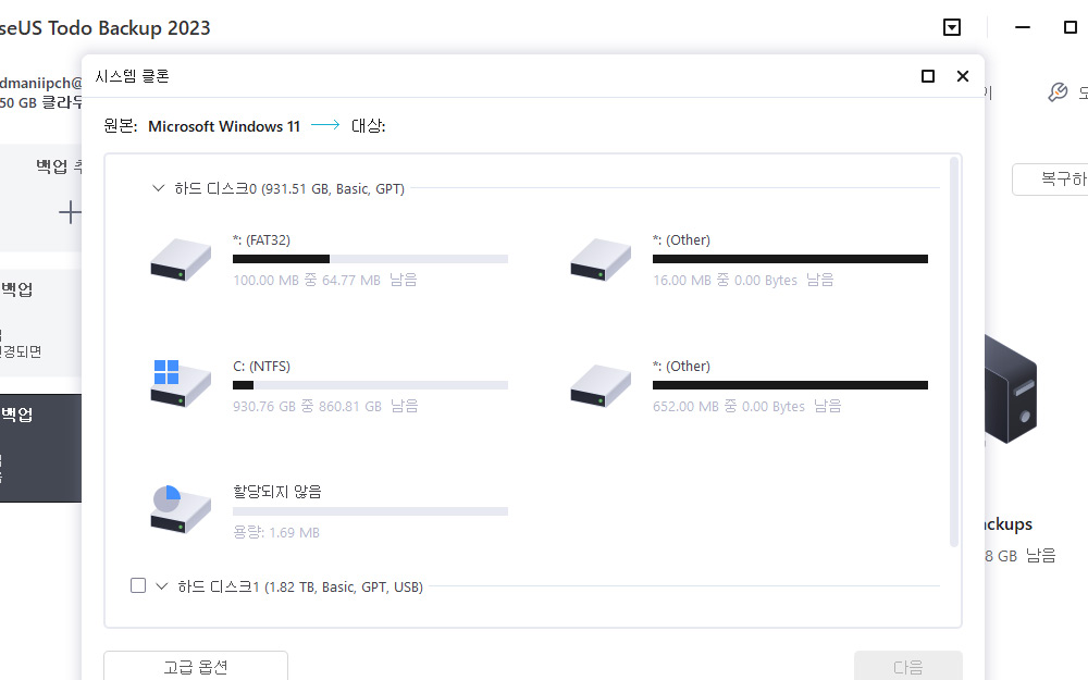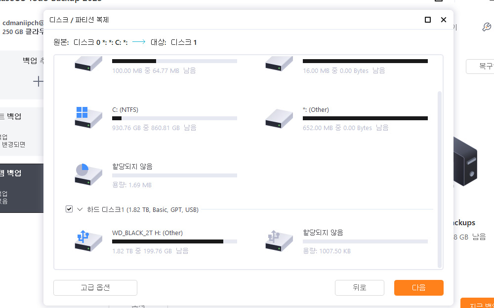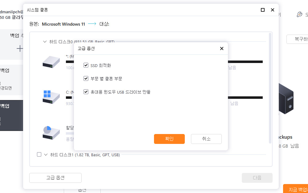 시스템 클론에서는 고급옵션을 통해서 SSD 최적화, 부분별 클론 작업 등을 할 수 있습니다.
