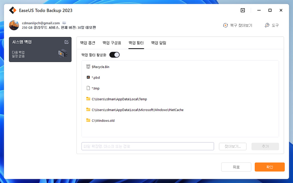 백업 필터도 가능합니다. 필요하지 않은 파일이나 폴더를 지정해서 백업이 안되도록 하는 것인데요. 기본적으로 임시폴더 임시파일이 지정되어 있습니다. 그리고 추가한다면 Onedrive 도 추가해서 빼는게 좋습니다. 어차피 클라우드에서 내려 받아서 다시 최신으로 생성될 것이므로 백업할 필요는 없죠.