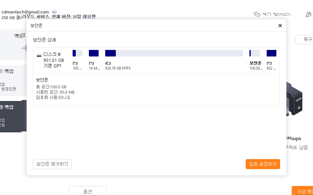 보안존도 있습니다. 시스템을 복제하거나 관리하는 툴이다 보니 이런 기능도 있네요. 별도의 안전 구역을 만들어서 랜섬웨어나 바이러스로부터 보호할 수 있습니다.