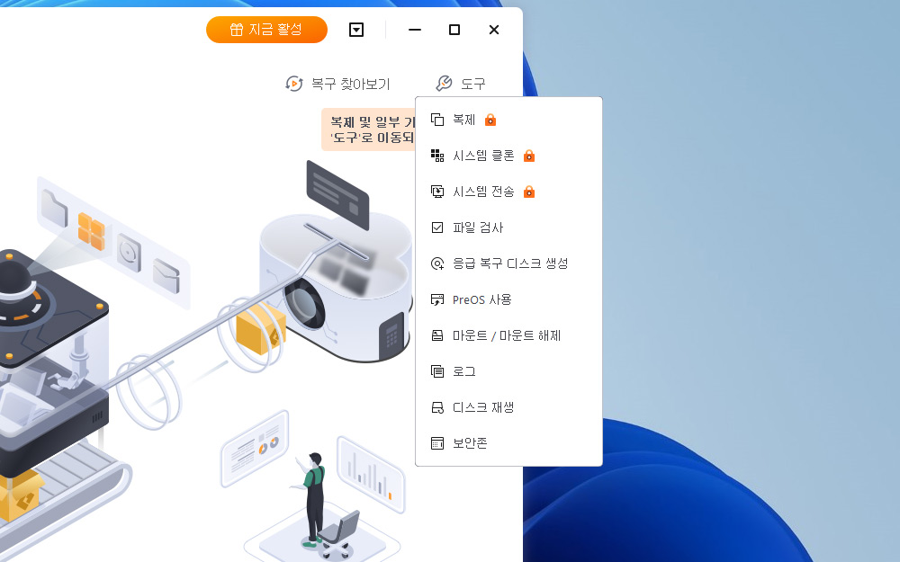 별도의 메뉴로 도구에 보면 복제, 시스템 클론, 시스템 전송, 파일검사 등 다양한 메뉴를 지원 합니다.